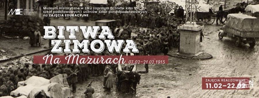 "Bitwa zimowa na Mazurach 07-21.02.1915". Celem spotkania jest zapoznanie uczestników z tematem I wojny światowej. Prowadzący skupi się głównie na przedstawieniu przyczyn wybuchu oraz opowie o przygotowaniach Prus i Rosji do Wielkiej Wojny. Przedstawi przebieg starć ze szczególnym uwzględnieniem bitwy na jeziorach mazurskich oraz bitwy zimowej na Mazurach, a także ich znaczenia dla dalszych losów wojny. Urozmaiceniem zajęć będzie możliwość wcielenia się uczestników w role oficerów sztabowych dwóch przeciwnych armii.
